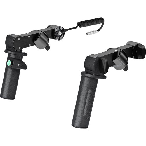 Extremely durable and ergonomically formed articulating handgrip for right camera side that attaches to the rosette of any ARRI camera. Includes REC button and short built-in cable to RS connector (Fischer 3 pin) and for left camera side without connector.